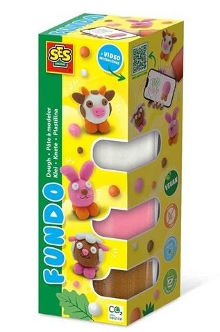 Ciasto FunDo - Zwierzęta hodowlane składa się z jasnych kolorów różu, bieli, brązu i pomarańczy z interaktywnym sposobem modelowania krowy, owcy i królika. Wykonanie szczegółowej figurki z ciasta może być nie lada wyzwaniem, ale zestaw FunDo jest precyzyjnie dostosowany do stworzenia 3 zabawnych figurek i zawiera poręczny patyczek do modelowania, instrukcję oraz kod QR z filmem instruktażowym krok po kroku. Ciasto jest klarowne, miękkie i można je łatwo wykorzystać ponownie dzięki zamykanym i poręcznym pojemnikom.