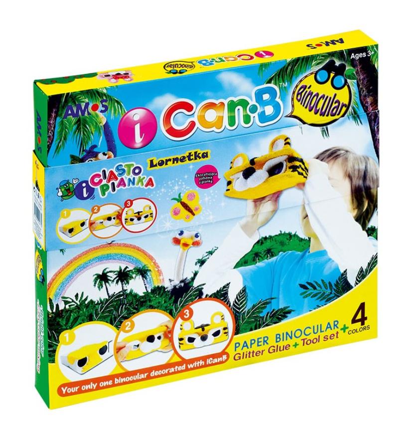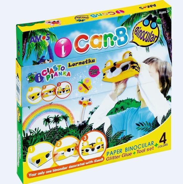 w zestawie: tekturowa lornetka do oklejenia, klej z brokatem 10,5 ml, Ciasto-Pianka 1 kolor w saszetce 50 g, Ciasto-Pianka 3 kolory w hermetycznych pudełeczkach, narzędzia, instrukcja