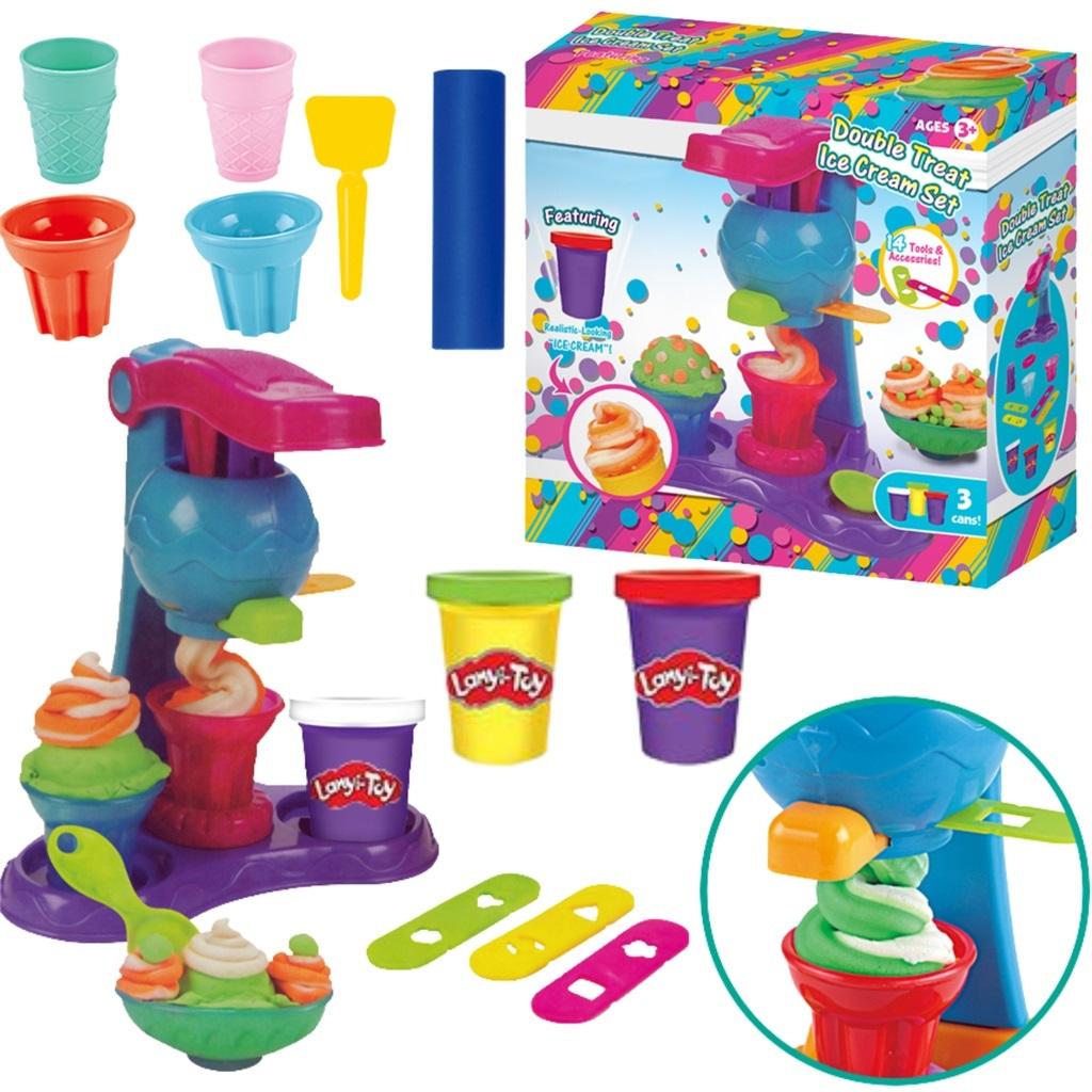W zestawie znajdują się trzy słoiczki z różnokolorową plasteliną, która symuluje różne smaki lodów. Dziecko może tworzyć własne kombinacje smakowe i eksperymentować z różnymi kształtami.