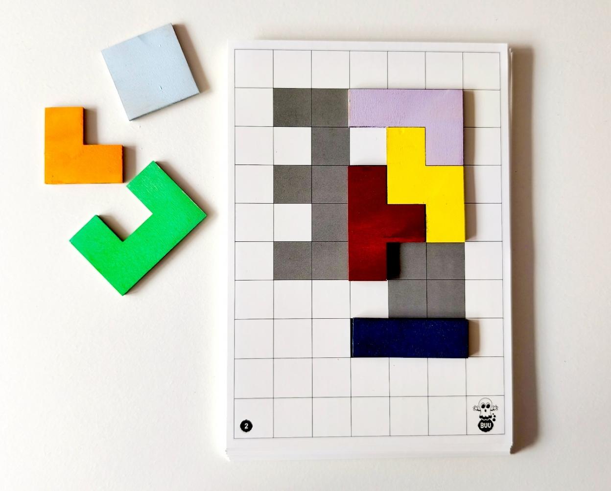 Zadaniem dziecka jest odtworzenie wzoru z planszy, w każdym przypadku ze wszystkich klocków.