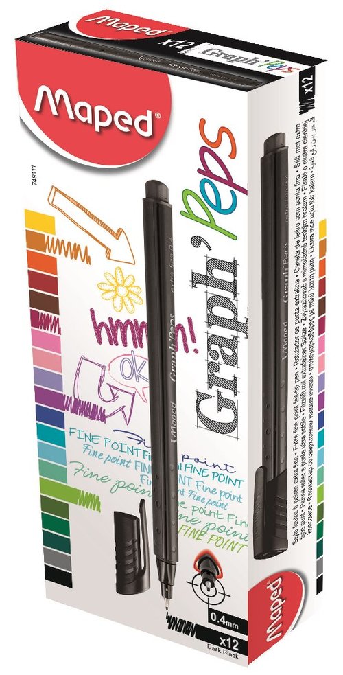 Cienkopis Graph'Peps. Uniwersalna linia cienkopisów dla każdego, do użycia w szkole, w domu i w biurze. Końcówka oprawiona w metal. Grubość końcówki 0,4mm. Bezpieczna, wentylowana skuwka z klipsem. Ergonomiczny, trójkątny kształt poprawia komfort pisania. Kolor czarny. JS: 12 szt.