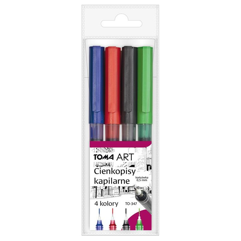 Cienkopisy kapilarne TO-347 Cienkopisy kapilarne z fibrową końcówką 0,5 mm, widoczny poziom tuszu, obudowa i nasadka wykonane z polipropylenu, wentylowana nasadka z klipem w kolorze tuszu, system "cap in cap" zabezpieczający końcówkę przed wyschnięciem, tusz cienkopisów jest łatwo spieralny, metalowe wsparcie końcówki pozwala na niebrudzące kreślenie przy linijce.