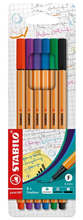 Uniwersalny cienkopis do pisania, podkreślania, kreślenia i kolorowania. Mocna, oprawiona w metal końcówka jest odporna na złamania i rozwarstwienia, co gwarantuje wysoki komfort pisania aż do całkowitego wyczerpania tuszu. Grubość linii - 0,4 mm. Wentylowana skuwka umożliwia oddychanie w przypadku nagłego połknięcia. Dostępny w 30. Plastikowe etui z zawieszką zawierające 6 szt.