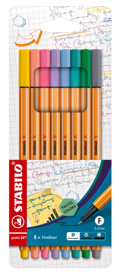 Niezaprzeczalny nr 1 wśród cienkopisów od 1977 r. W każdej sekundzie sprzedają się 4 cienkopisy point 88 w Europie. Uniwersalny cienkopis do pisania, podkreślania, kreślenia i kolorowania. Mocna, oprawiona w metal końcówka jest odporna na złamania i rozwarstwienia, co gwarantuje wysoki komfort pisania aż do całkowitego wyczerpania tuszu. Grubość linii 0,4 mm. Wentylowana skuwka umożliwia oddychanie w przypadku nagłego połknięcia. Jedyny cienkopis dostępny aż w 47 kolorach. Plastikowe etui z zawieszką zawierające 8 szt. w pastelowych kolorach