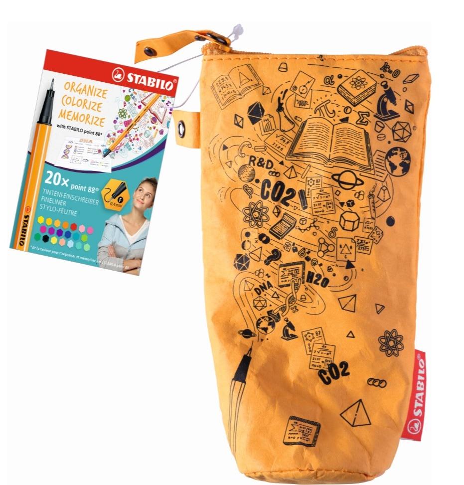 STABILO(R) point 88(R) 20 szt. w wytrzymałym piórniku z włókna papierowego to aż dwadzieścia pięknych kolorów najbardziej rozpoznawalnego cienkopisu STABILO. Produkt o grubości pisania 0,4 mm przeznaczony dla uczniów, studentów i profesjonalistów. Idealnie nadaje się do pracy z linijką i szablonem. Mocna końcówka oprawiona w metal. Cienkopis posiada wentylowaną skuwkę (drożność przepływu powietrza w razie połknięcia), jest również odporny na zasychanie, mimo pozostawienia bez skuwki na długi czas. Cienkopisy zapakowane są w ekologiczny, estetyczny, wytrzymały piórnik z zamkiem, wykonany w 80% z włókna papierowego pochodzącego ze zrównoważonej produkcji. Piórnik ozdobiony jest modnymi motywami szkolnymi, posiada także specjalny dodatkowy otwór służący zabezpieczeniu zawartości.