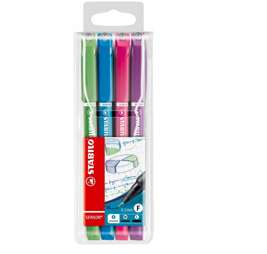 CIENKOPIS STABILO SENSOR. Cienkopis z amortyzowaną końcówką. Idealny cienkopis dla wymagających twórców i kreatywnych umysłów. Nowoczesny design w 8 intensywnych kolorach. Mocna amortyzowana końcówka oprawiona w metal uniemożliwia wygięcie lub złamanie i daje komfort podczas pisania. Doskonale sprawdza się przy pracy z linijką lub szablonem. Wentylowana skuwka. Szerokość linii 0,3 mm. Plastikowe etui z zawieszką zawiera 4 szt cienkopisów: jasny zielony, turkusowy, różowy, fioletowy.