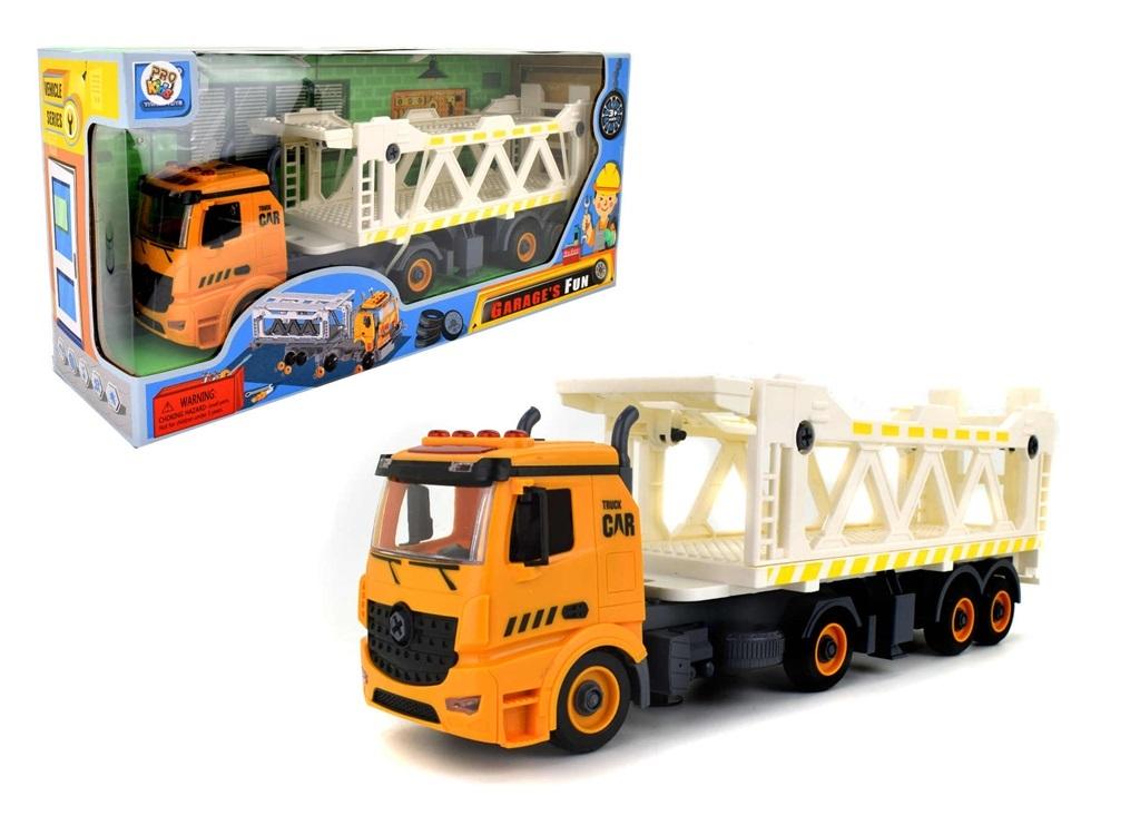 Ciężarówka z dwupoziomową lawetą doskonale sprawdzi się do przewożenia innych pojazdów. Rozkładana rampa lawety ułatwia wjazd samochodom na najwyższe piętro. Dziecko może bawić się również w konstruktora dzięki specjalnym śrubom, które z łatwością przykręci i odkręci. Plastikowy śrubokręt z 3 końcówkami pozwala bezpiecznie rozkręcać pojazd. Laweta posiada podpórkę, dzięki temu może stać samodzielnie po odłączeniu od ciężarówki.