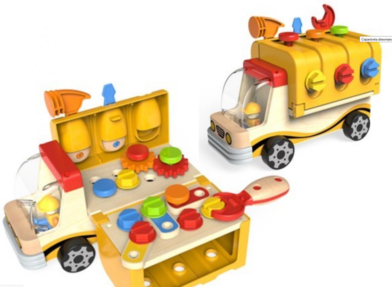 Kolorowa ciężarówka z narzędziami to idealna zabawka dla każdego chłopca. Wszystko wykonane jest z drewna i plastiku. Zabawka rozwinie zdolności manualne dziecka.