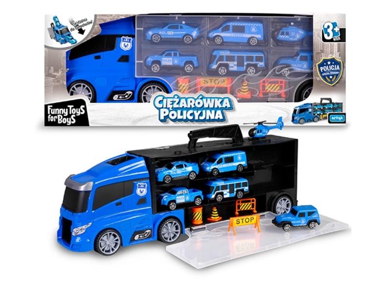 W zestawie: ciężarówka - walizka, 5 aut, helikopter, akcesoria drogowe, funkcje: napęd frykcyjny, wyrzutnia samochodów w ciężarówce, dł. ciężarówki 58 cm.