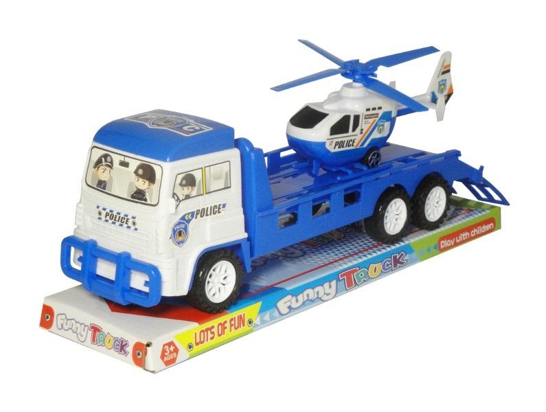 Zabawka ciężarówka policyjna z przyczepą. Na przyczepie przewożony jest helikopter. Produkt dla dzieci od 3 lat. Zabawka zapakowana w kartonową podstawkę z przezroczystym kloszem. Podane wymiary są wymiarami produktu w opakowaniu.