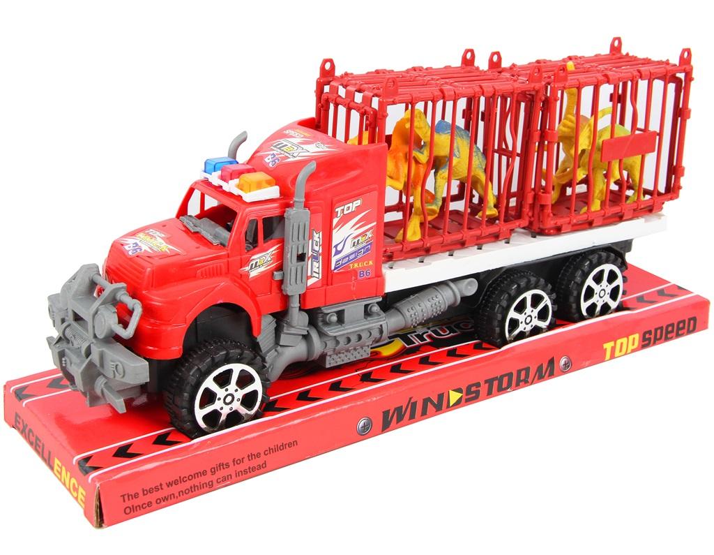 Plastikowy, ciężarowy samochód przewożący klatki z dinozaurami.