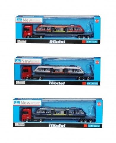 Zestaw ciężarówka laweta z tramwajem. Produkt występuje w kilku wersjach kolorystycznych, wybierany losowo. Cena dotyczy jednej sztuki.