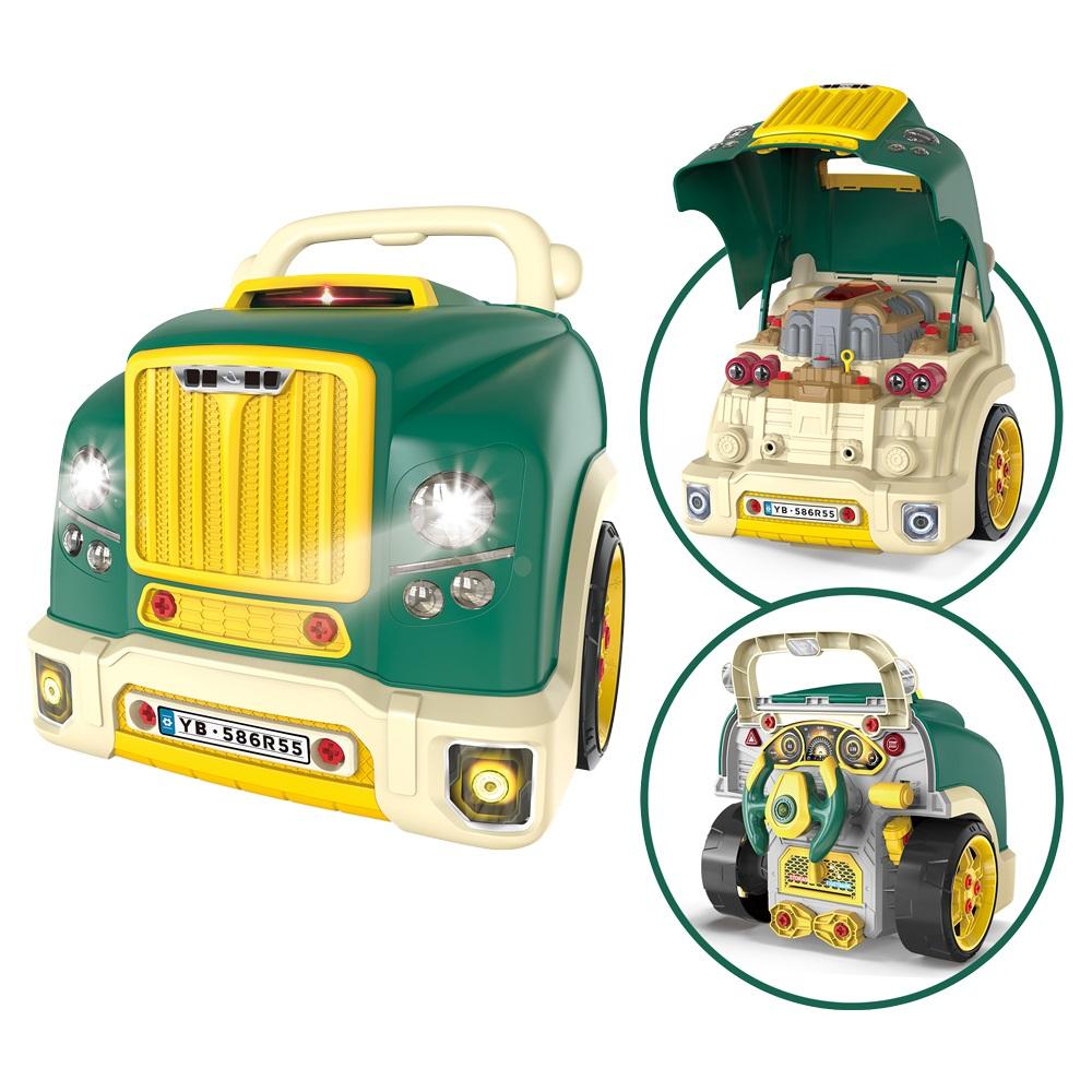 Ciężarówka w warsztacie samochodowym 59 elem. Pod maską mnóstwo akcesoriów do przykręcania, efekty świetlne i dźwiękowe. Wymiary: 35 x 34.5 x 37.5 cm, zasilanie 3xAA (brak w zestawie)