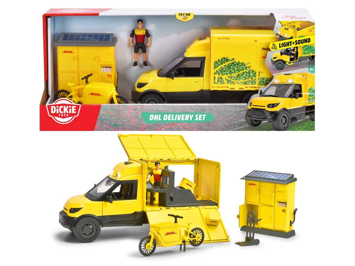 Ciężarówka dostawcza na licencji firmy kurierskiej DHL z licznymi akcesoriami, funkcją światła i dźwięku. Ma otwieraną naczepę, w środku taśma do segregacji paczek, figurka kuriera, rower z koszem, wózek do rozładunku oraz przenośny automat na paczki. Długość: 25 cm, 3l+