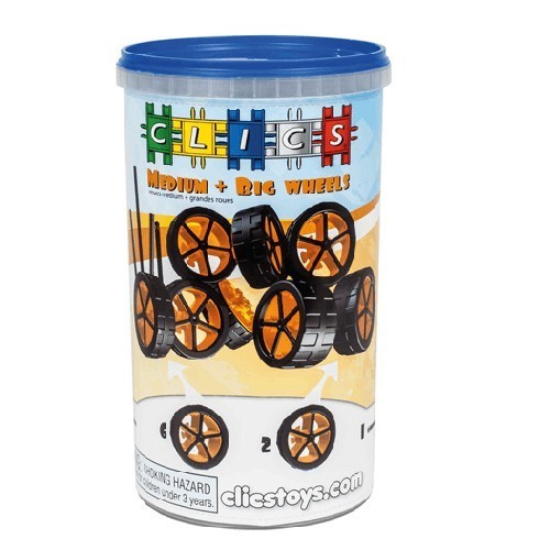 Zestaw zawiera 12 specjalnych elementów: 6 mniejszych kół 2 duże koła 3 średnie osie 1 długa oś Dla dzieci w wieku od 4 lat