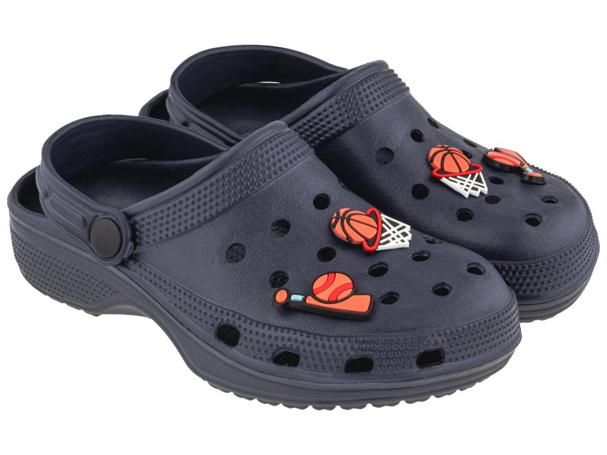 Praktyczne i stylowe clogi dziecięce w kolorze granatowym to idealne obuwie na lato - świetne na plażę, do ogrodu, czy codziennego użytku. Model ozdobiony został gumowymi pinami o sportowej tematyce - na każdym clogu znajdują się 3 piny, które można dowolnie przekładać i umieszczać w otworach wentylacyjnych. To nie tylko ciekawy element dekoracyjny, ale też zabawa dla dziecka, które może samodzielnie personalizować swoje buty. Clogi wykonane są z miękkiego, elastycznego i wytrzymałego tworzywa EVA, które jest lekkie, wodoodporne i łatwe do czyszczenia. Dzięki temu idealnie sprawdzają się zarówno w domu, jak i na zewnątrz, np. podczas letnich aktywności. Dla większego komfortu i bezpieczeństwa buty wyposażone zostały w ruchomy pasek na piętę, który pomaga utrzymać stopę we właściwej pozycji podczas chodzenia, zapobiegając jej wysuwaniu się Długość wkładki: 20,5 cm