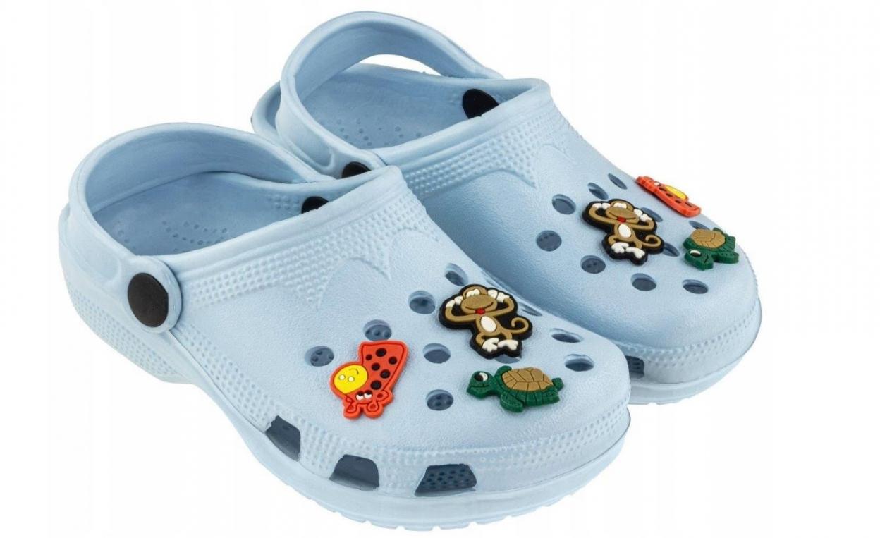 Urocze clogi dziecięce w kolorze niebieskim to idealne obuwie na lato - sprawdzą się zarówno w domu, jak i na zewnątrz, np. w ogrodzie, na plaży czy podczas wakacyjnych wyjazdów. Model został ozdobiony gumowymi pinami w kształcie małpki, żyrafy, żółwia - po trzy na każdego cloga. Piny można dowolnie przekładać i umieszczać w otworach wentylacyjnych, co daje dziecku możliwość personalizacji i zabawy wyglądem obuwia. Clogi wykonane są z miękkiego, lekkiego i elastycznego tworzywa EVA, które zapewnia wysoki komfort noszenia, jest łatwe w czyszczeniu i odporne na wilgoć. Dzięki swojej lekkości buty nie męczą stopy nawet po wielu godzinach noszenia. Dodatkowo model wyposażony został w ruchomy pasek na piętę, który można przełożyć do przodu lub zostawić z tyłu - co pomaga utrzymać stopę we właściwym miejscu i zwiększa stabilność podczas chodzenia. Długość wkładki: 15 cm