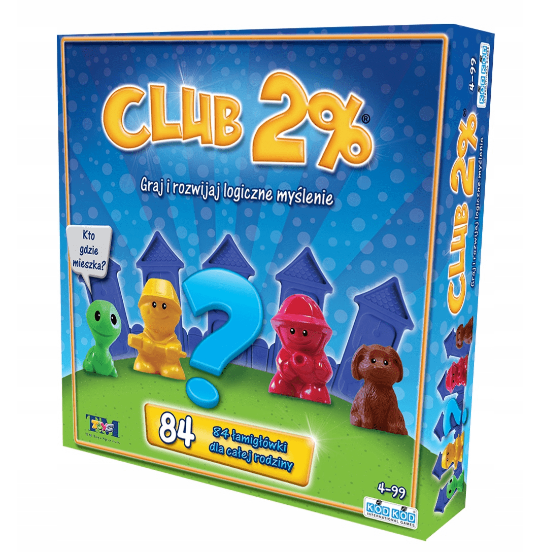 Wciągająca zabawa dla całej rodziny Inspiracją powstania gry Klub 2% było zastosowanie tej samej logiki rozumowania, która jest podstawą zagadki Einsteina. Słynny fizyk miał powiedzieć, że jedynie 2% ludzi na całym świecie jest w stanie ją rozwiązać. Klub 2% stawia przed Tobą ekscytujące zagadki, które zachęcają do logicznego myślenia krok po kroku. Kto gdzie mieszka? - Wybierz kartę z zadaniem z zestawu 84 kart o wzrastającej trudności i wykorzystaj podpowiedzi, żeby ustalić, jak umieścić ludziki i zwierzęta w domkach. - Podpowiedzi są pokazane w formie prostych symboli, opracowanych specjalnie po to, aby w łatwy sposób rozwijać umiejętności matematycznego myślenia i rozwiązywania problemów, przy czym nie wymagają umiejętności czytania. - Korzystanie z podpowiedzi zachęca do rozróżnienia pomiędzy istotnymi, a drugorzędnymi informacjami - karta po karcie, pracując kreatywnie, stopniowo opanujesz procesy logicznej dedukcji, jednocześnie bawiąc się. - Uważasz, że zagadka jest rozwiązana? Rozwiązanie znajdziesz na odwrocie karty: czy wszyscy są na właściwych miejscach? Gra Klub 2% intryguje, angażuje, uczy i bawi całą rodzinę. Zawartość: - 5 plastikowych domków - 10 plastikowych pionków do gry - 5 ludzików i 5 zwierząt - 84 karty z zadaniami - Szczegółowe instrukcje Wiek graczy: 4-99 Liczba graczy: 1 Czas rozgrywki: 15+ minut