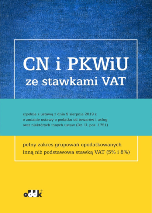 Od dnia 1 kwietnia 2020 r. podstawą identyfikacji stawek VAT stają się - w odniesieniu do towarów Nomenklatura Scalona CN, a w zakresie usług PKWiU 2015. Opracowanie zawiera wyciąg z klasyfikacji CN i PKWiU 2015 z przyporządkowanymi odpowiednim symbolom stawkami VAT z wyjaśnieniami – szczegółowy, pełny zakres grupowań opodatkowanych inną niż podstawowa stawką VAT (5% i 8%). W publikacji także: - wykaz towarów i usług opodatkowanych stawką 5% i 8% bez względu na kod CN czy PKWiU - wyciąg z ustawy z dnia 11 marca 2004 r. o podatku od towarów i usług (Dz. U. z 2018 r. poz. 2174, z późn. zm.) - wyciąg z ustawy z dnia 9 sierpnia 2019 r. o zmianie ustawy o podatku od towarów i usług oraz niektórych innych ustaw (Dz.U. poz. 1751).