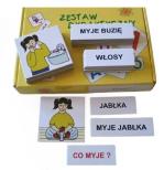 Zestaw plakietek i etykietek służy do przenoszenia obrazów z rzeczywistości na obrazki, uświadamianiu dziecku, że słowo (napis) oznacza konkretną rzecz, czynność czy sytuację oraz do nauki czytania. Uczy dziecko rozumienia pytań oraz udzielania odpowiedzi.Zestaw ten słuzy do nauki odnajdywania na obrazku sytuacji przedstawionych w rzeczywistości, imitowania czynności mycia określonych części ciała lub przedmiotów na podstawie obrazka - rozumienie pytania: Co myje?, oraz udzielania odpowiedzi obrazkiem, etykietką lub słowem, do nauki czytania globalnego (całymi wyrazami), zapamiętywania zdania dwuwyrazowego. - 10 elementów obrazkowych