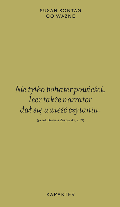 Nietłumaczony dotąd na język polski ostatni tom esejów, który ukazał się za życia amerykańskiej intelektualistki. Teksty powstałe w latach 1982–2001 dotyczą literatury, filmu, teatru, sztuki oraz tańca współczesnego. Sontag porusza się po tych tematach ze znawstwem i dociekliwością. Najwięcej miejsca poświęca literaturze. Przygląda się językowi poezji i prozy, interpretuje dzieła tych, których podziwiała i których zachłannie, choć niebezkrytycznie, czytała (Cwietajewej, Gombrowicza, Sebalda, Walsera, Zagajewskiego, Machado de Assisa, Barthes’a), oraz pisarzy i pisarek, z którymi łączyła ją przyjaźń (Kiš czy Hartwick). Poprzez teksty kultury przygląda się nowym trendom, żegna ze światem wielkich narracji (jej ukochane kino!), próbuje zajrzeć pod powierzchnię tego, co polityczne – gdy opisuje wyzwania związane z wystawieniem Czekając na Godota w Sarajewie. By zbadać związki między tym, co rzeczywiste, i tym, co nierzeczywiste, sięga do bunraku, a gdy chce oddać hołd radosnej energii twórczej, przywołuje obrazy Howarda Hodgkina. Z jej zapisków przebija pasja odkrywania i opisywania świata, ale i niepokój o to, co przyniesie przyszłość. „Dziś książki są gatunkiem zagrożonym. Przez książki rozumiem także takie warunki czytania, w których literatura może istnieć i wpływać na duszę” – pisze w datowanym na 1996 rok bardzo osobistym liście do Borgesa.