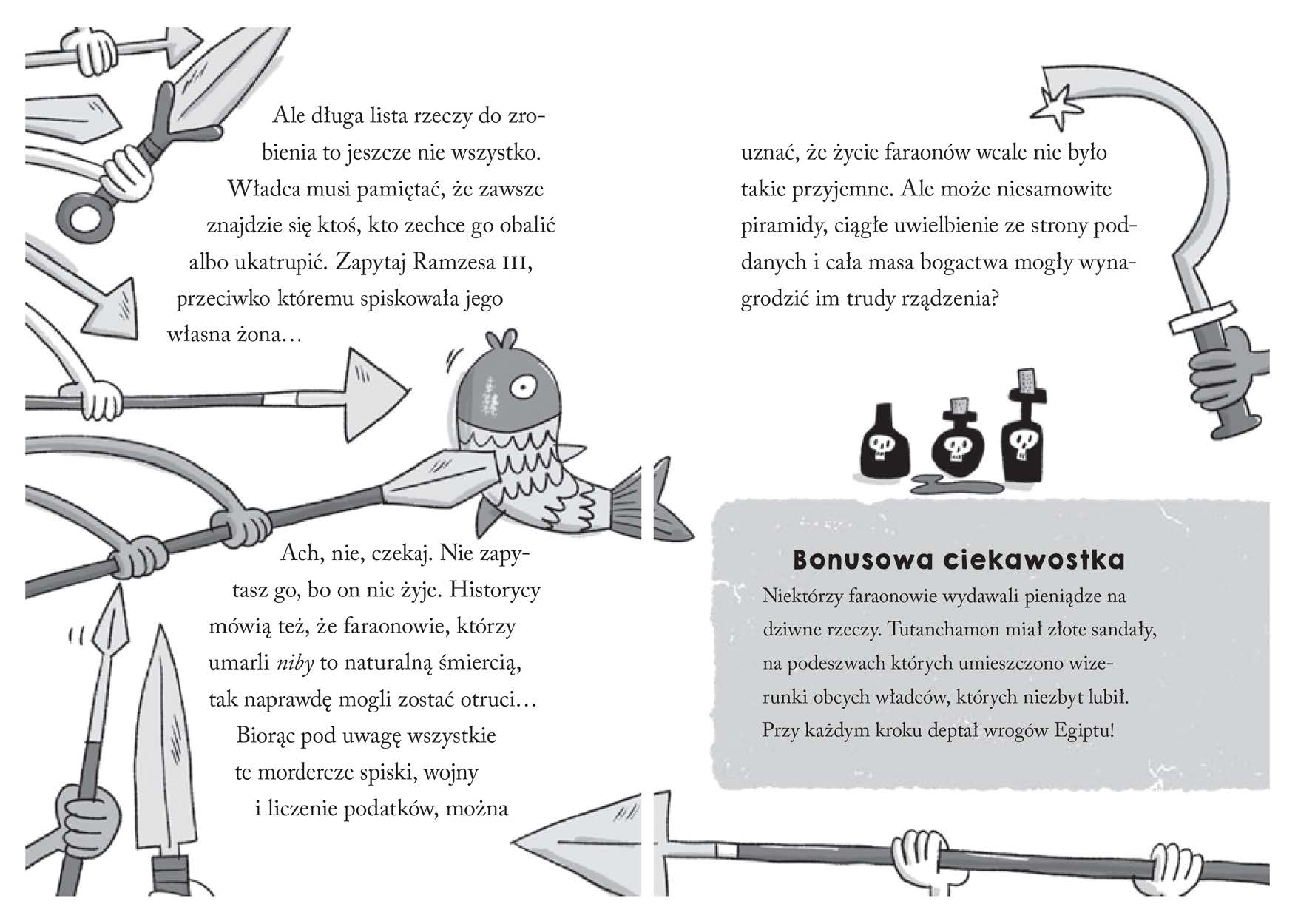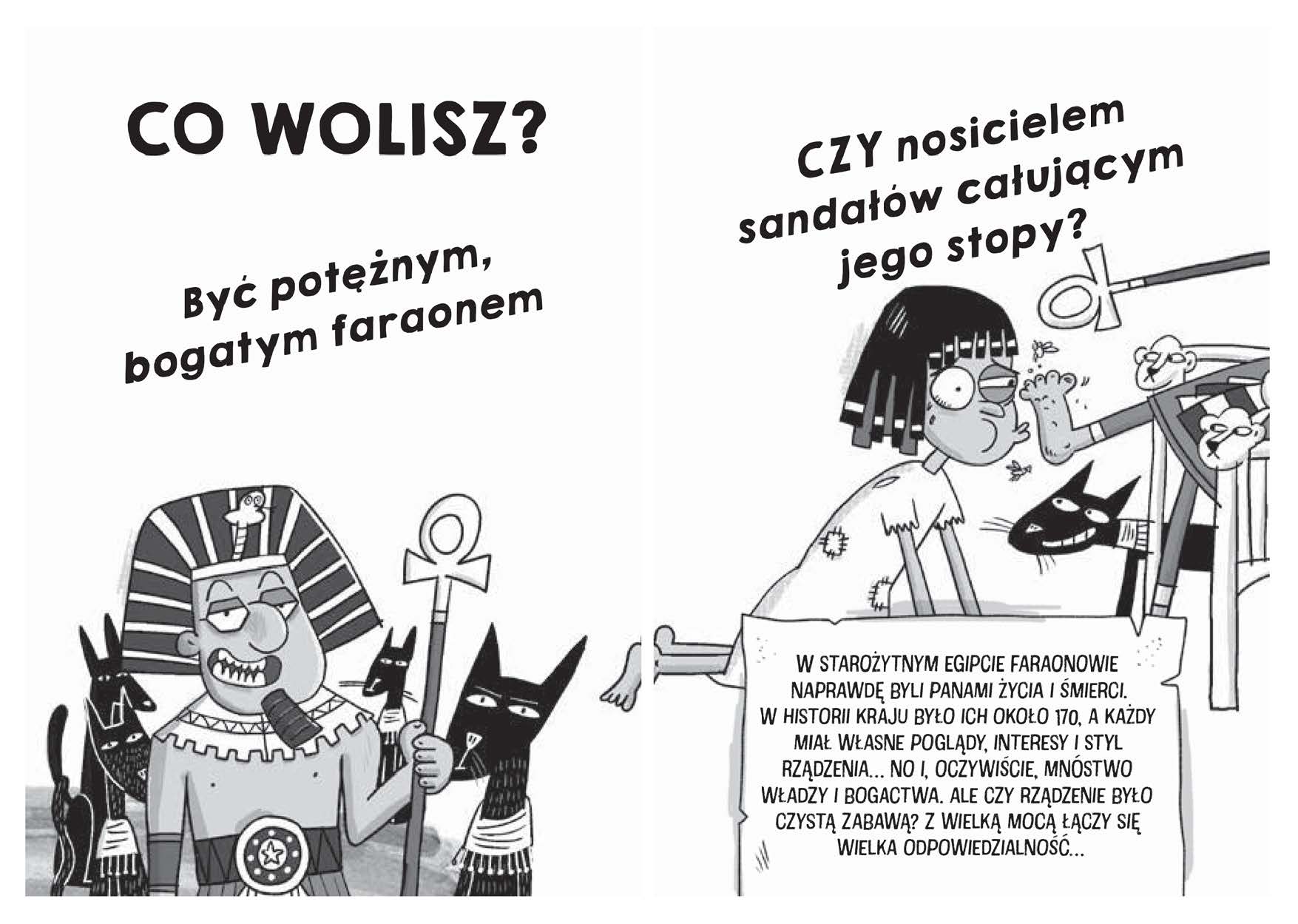 CO WOLISZ? Przygotowywać ciało do zrobienia z niego mumii – przemywać nieboszczyka winem, wyciągać z niego serce i zawijać go w kilometry bandaży? Przydadzą się mocne ręce i jeszcze bardziej wytrzymały żołądek… A może wolisz wykuwać w kamieniu hieroglify? Dobrze się zastanów, zanim wybierzesz! W tej książce to TY decydujesz, kim chcesz zostać. A przy okazji odkryjesz mroczne tajemnice piramid. Sprawdzisz, dlaczego Egipcjanie jedli strusie i po co Tutenchamonowi było 130 lasek do chodzenia. Dowiesz się, czym jest klątwa faraona i czy ona naprawdę istnieje. Uwaga, będzie szalenie zabawnie i… trochę strasznie!