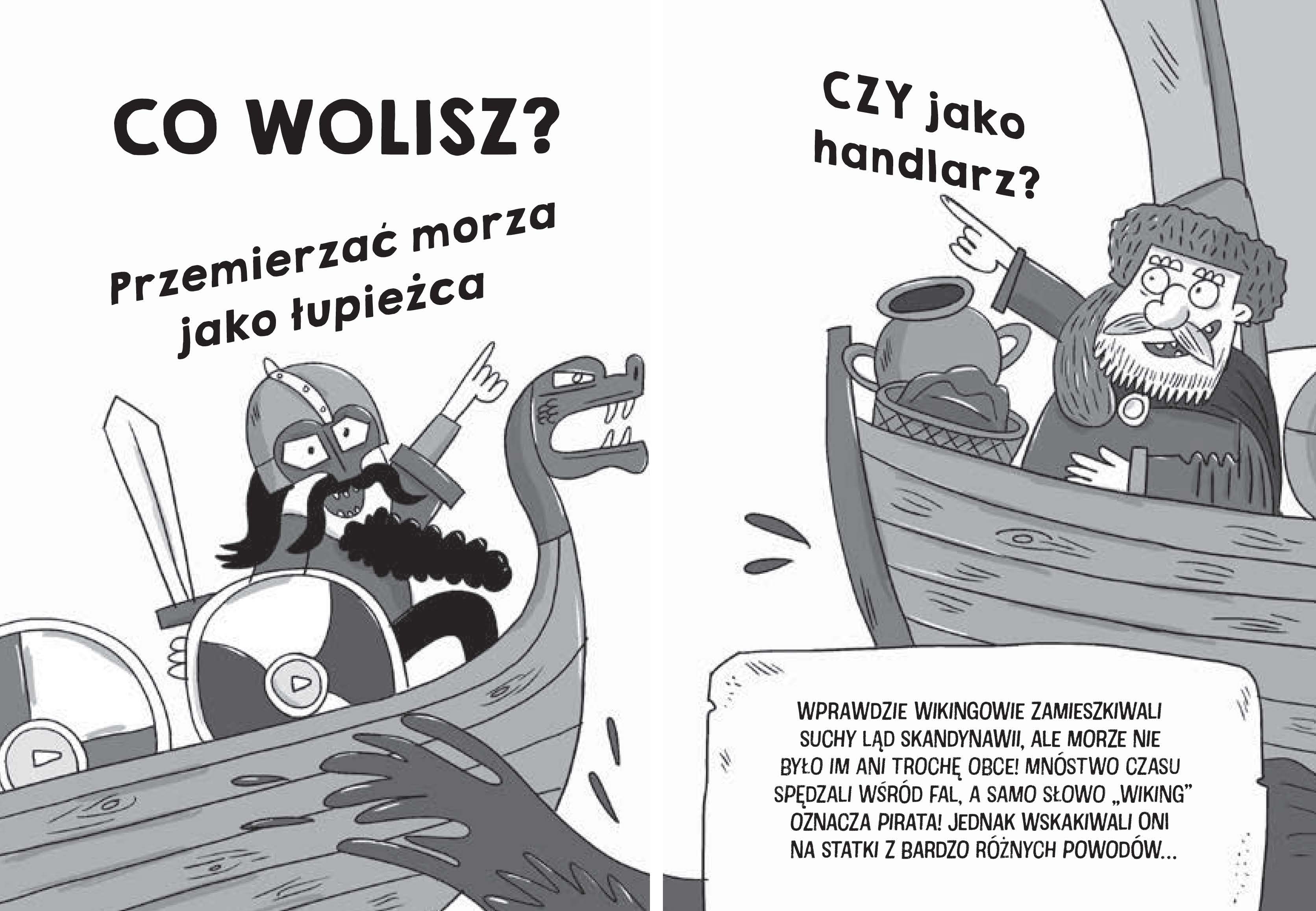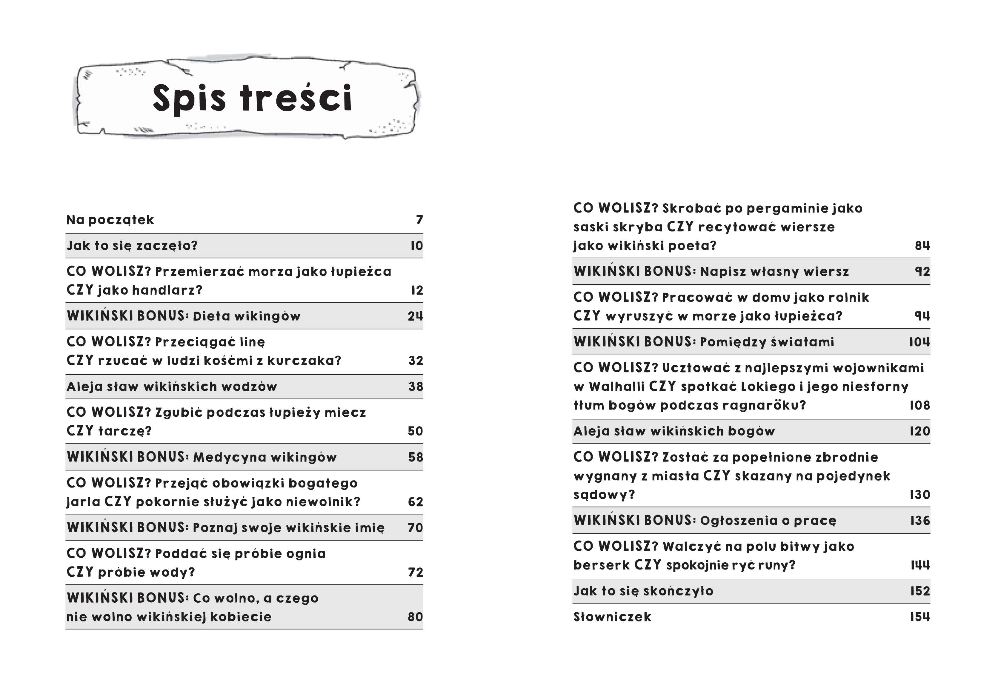 CO WOLISZ? Poddać się próbie ognia czy próbie wody? Kiedy jakiś wiking nieźle narozrabiał, bo ukradł owcę albo wyzwał kolegę od tchórzy (najgorzej!), nie miał takiego wyboru. W tej książce to TY decydujesz! A przy okazji dowiesz się, dlaczego wszyscy bali się boga Thora i jak smakował gnijący rekin. Czy słynny wiking Eryk Rudy naprawdę miał rude włosy? Czym zasłużył sobie na swój przydomek Eyolf Głupiec, a czym Harald Sinozęby?
