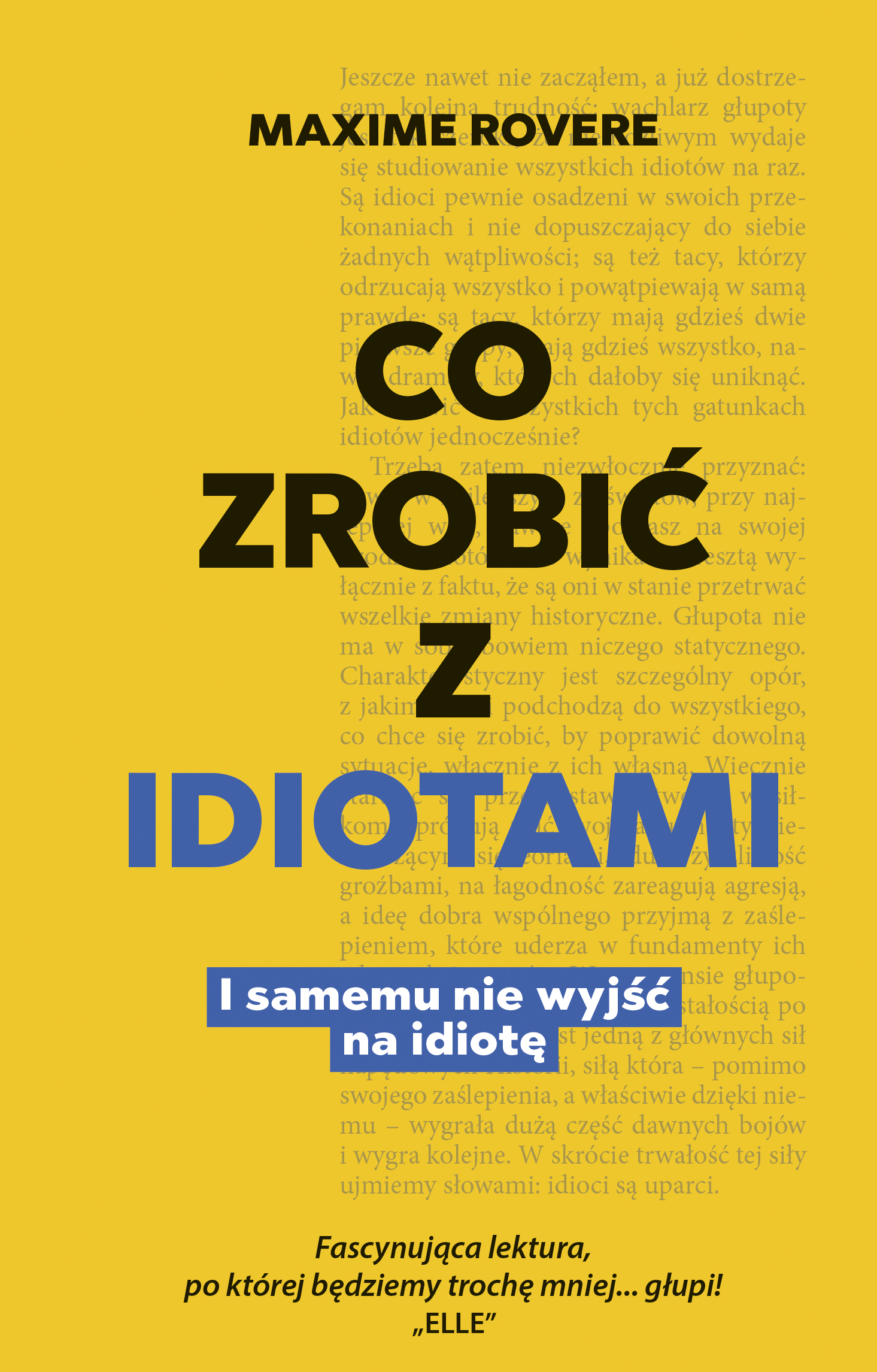 Masz wrażenie, że otaczają cię idioci, którzy sprzysięgli się, by zatruć ci życie? Nie możesz ich zignorować ani przed nimi uciec. Spotykasz ich wszędzie: w sklepie, w pracy, na rodzinnym obiedzie, na imprezie, w urzędzie… Próbujesz nie czytać komentarzy internetowych oszołomów, szerzących w sieci swoje spiskowe teorie i rozpowszechniających fake newsy niczym zarazę. Nieopatrznie włączasz jednak telewizor, a tam… debata sejmowa. Jeśli poraża cię wszechobecna głupota i wciąż zadajesz sobie pytanie, skąd wzięli się ci wszyscy ignoranci i dlaczego to właśnie oni zawsze wygrywają – przeczytaj tę książkę. Filozof Maxime Rovere z humorem, łagodną ironią i mądrością analizuje sytuacje dnia codziennego. Pokazuje, jak nie dać się złapać w pułapki, które zastawiają na nas idioci, jak rozmawiać z tymi, którzy nie chcą słuchać, a przede wszystkim: jak nie dać się wyprowadzić z równowagi i zachować zimną krew, by samemu nie wyjść na idiotę. a książka to prawdziwe lekarstwo na plagę naszych czasów i zbiorową chorobę, która niszczy nam życie – głupotę. Analizując fenomen idiotów, (...) Maxime Rovere proponuje nam poradnik samoobrony przed nieznośnymi ignorantami oraz etyczną refleksję nad życiem w społeczeństwie. LIVRES HEBDO Maxime Rovere jest francuskim pisarzem, tłumaczem i profesorem, specjalistą od filozofii Spinozy. Współpracuje z „Magazine Littéraire”. Jego zainteresowania naukowe sytuują się na granicach historii filozofii, antropologii i sztuki współczesnej. Prawdziwa lekcja pokory. „L’EXPRESS” Ta książka skrzy się humorem. „LE POINT”