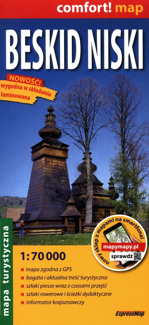 Doliny nieistniejących już wsi, wpisana na listę UNESCO cerkiew św. Paraskewy w Kwiatoniu, renesansowy dwór obronny w Szymbarku, cmentarze z okresu I wojny światowej czy skansen łemkowski w Zyndranowej to tylko niektóre interesujące miejsca w Beskidzie Niskim. Dwustronnie laminowana, wygodna w składaniu mapa turystyczna Beskidu Niskiego pomoże odnaleźć ich znacznie więcej. Publikacja została opracowana we współpracy z doświadczonymi krajoznawcami z regionu. Cechy mapy: • dogodna zarówno dla pieszego, jak i rowerzysty skala 1:70 000 (1 cm – 700 m), • bogata treść turystyczna, • zgodność z GPS – współrzędne geograficzne w układzie WGS-84. Na mapie m.in.: • szlaki piesze i czasy przejść, szlaki rowerowe, ścieżki dydaktyczne, muzea, zabytki i inne interesujące obiekty, • obiekty noclegowe: schroniska młodzieżowe, kempingi, pola namiotowe, hotele i pensjonaty, • parki narodowe i krajobrazowe, rezerwaty przyrody, atrakcje przyrodnicze, • cieniowanie plastycznie pokazujące ukształtowanie terenu, • informator krajoznawczy.