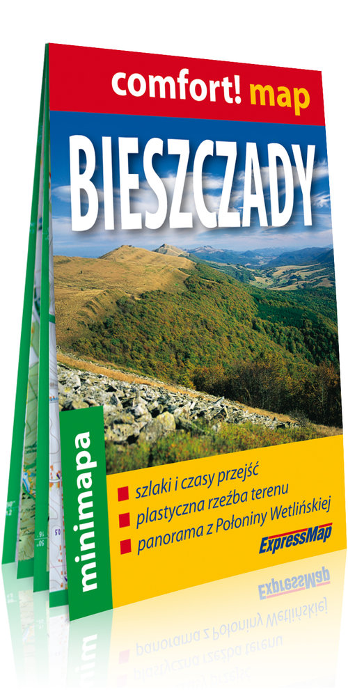 Bieszczady Miniaturowa mapa turystyczna Bieszczadów mieści się w dłoni – dosłownie! Publikacja jest dwustronnie laminowana i wygodna w składaniu, a w jej w skład wchodzą: • mapa Bieszczadów w skali 1:200 000 (1 cm – 2000 m) z zaznaczonymi szlakami pieszymi wraz z podanymi czasami przejść, schroniskami, wyciągami narciarskimi, a także cieniowaniem plastycznie pokazującym rzeźbę terenu, • panorama z Połoniny Wetlińskiej z opisami widocznych szczytów.