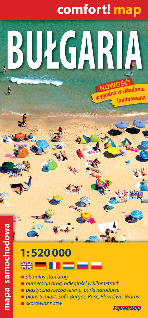 Z dwustronnie laminowaną mapą samochodową Bułgarii podróż od Vidinu po Rezovo będzie czystą przyjemnością. Oprócz aktualnych informacji drogowych, publikacja wzbogacona jest o treść turystyczną, m.in. parki narodowe, jaskinie, zamki, zabytkowe meczety, klasztory i cerkwie prawosławne. Mapa jest wyjątkowo trwała i łatwa w składaniu.Na mapie m.in.:stan dróg 2015, odcinki w budowie,szczegółowa kategoryzacja i numeracja dróg,odległości drogowe w kilometrach,lotniska międzynarodowe,plastyczna rzeźba terenu,lasy, parki narodowe,treść turystyczna, m.in. jaskinie, zabytkowe klasztory prawosławne, zabytkowe cerkwie, zabytkowe meczety, latarnie morskie, zamki, ruiny zamków, ruiny antyczne i dolmeny oraz parki narodowe,skorowidz miejscowości.Seria comfort! map to praktyczne mapy na każdą okazję. Dwustronnie laminowane i wodoodporne, nie tracą walorów użytkowych przez długi czas, można na nie nanosić i ścierać notatki, a także bez trudu złożyć w dowolny sposób