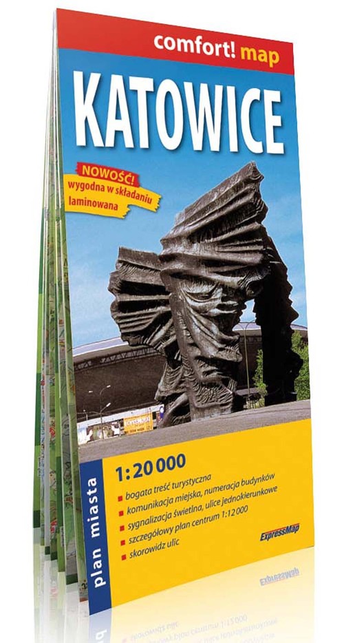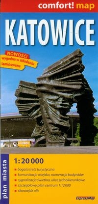Dwustronnie laminowany, łatwy w składaniu i trwały plan Katowic w skali 1:20 000. Swoim zasięgiem obejmuje miasto w pełnych granicach administracyjnych. Zaletą planu jest szczegółowy rysunek zabudowy z dokładną numeracją budynków wzdłuż ulic oraz na osiedlach. Plan zawiera treść przydatną zarówno dla użytkownika zmotoryzowanego jak i korzystającego z komunikacji miejskiej - m. in. szczegółową sieć ulic, ulice jednokierunkowe, sygnalizację świetlną, parkingi, stacje benzynowe, numerację dróg krajowych i wojewódzkich, linie tramwajowe i autobusowe wraz z przystankami, apteki całodobowe, budynki użyteczności publicznej, centra handlowe, zabytki. Dodatkowo zamieszczono plan centrum miasta w skali 1:12 000, mapę okolic Katowic, schematy nocnych linii autobusowych i tramwajowych oraz skorowidz ulic.