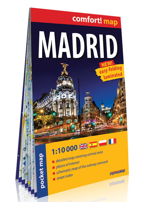 Madryt - laminowany plan miasta 1:10 000- mapa kieszonkowa format: 67 x 32 cm, po złożeniu 9,6 x 16 cm- dwustronnie laminowany, wygodny w składaniu kieszonkowy plan interesujących dla turysty, centralnych dzielnic miasta- szczegółowa skala 1:10 000 (1 cm ? 100 m)- bogata treść turystyczna, m.in.: zabytki, muzea, hotele i inne istotne obiekty- linie i stacje metra oraz kolei podmiejskiej- schemat metra- skorowidz ulic.