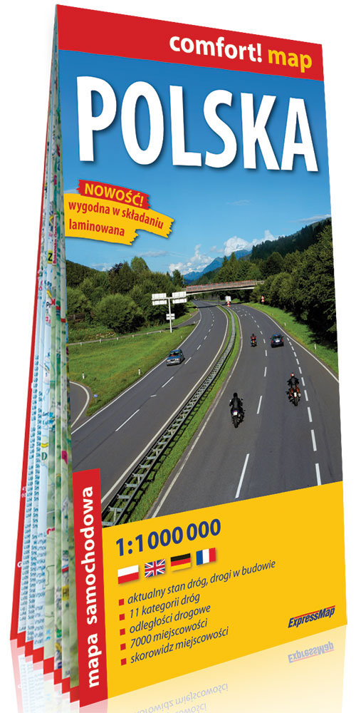 Polska Z mapą samochodową Polski podróż od Gdańska po Kraków będzie czystą przyjemnością. Publikacja zawiera aktualne informacje drogowe, a do tego jest całościowo pokryta laminatem, wyjątkowo trwała, wodoodporna i łatwa w składaniu. Na mapie m.in.: • aktualny stan dróg, odcinki w budowie, • szczegółowa kategoryzacja i numeracja dróg, wyróżnienie płatnych odcinków autostrad, • odległości drogowe w kilometrach, • promy samochodowe, • plastyczna rzeźba terenu, lasy, parki narodowe, • skorowidz miejscowości.