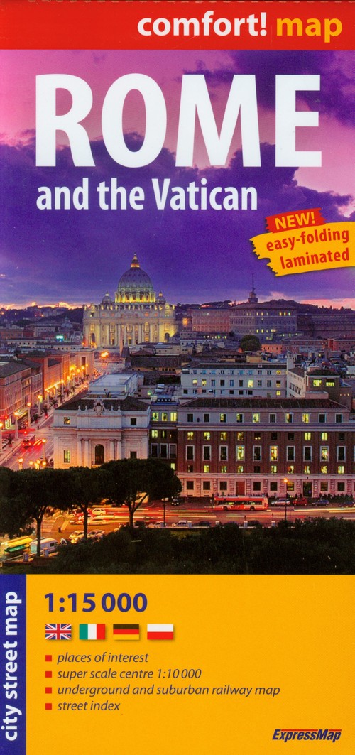 Rzym i Watykanlaminowany plan miasta 1:15 000format: 68 x 47 cm, po złożeniu 11 x 24 cm? dwustronnie laminowany, wygodny w składaniu plan interesujących dla turysty, centralnych dzielnic miasta? szczegółowa skala 1:15 000 (1 cm ? 150 m)? bogata treść turystyczna, m.in.: zabytki, antyczne ruiny, muzea, hotele, schroniska młodzieżowe i inne istotne obiekty? linie i stacje metra oraz kolejki podmiejskiej? linie i przystanki tramwajowe? cieniowanie plastycznie pokazujące urozmaicone ukształtowanie terenu Miasta Siedmiu Wzgórz? plan zabytkowego centrum Rzymu w szczegółowej skali 1:10 000 (1 cm ? 100 m)? skorowidz ulic