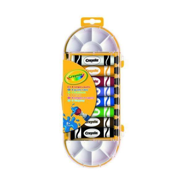 Lubisz malować? Wypróbuj farby tempery Crayola! Zawartość: 8 kolorów farb tempery w tubkach pędzelek mini pojemniczki do mieszania farb. Dla dzieci od 4 roku życia.