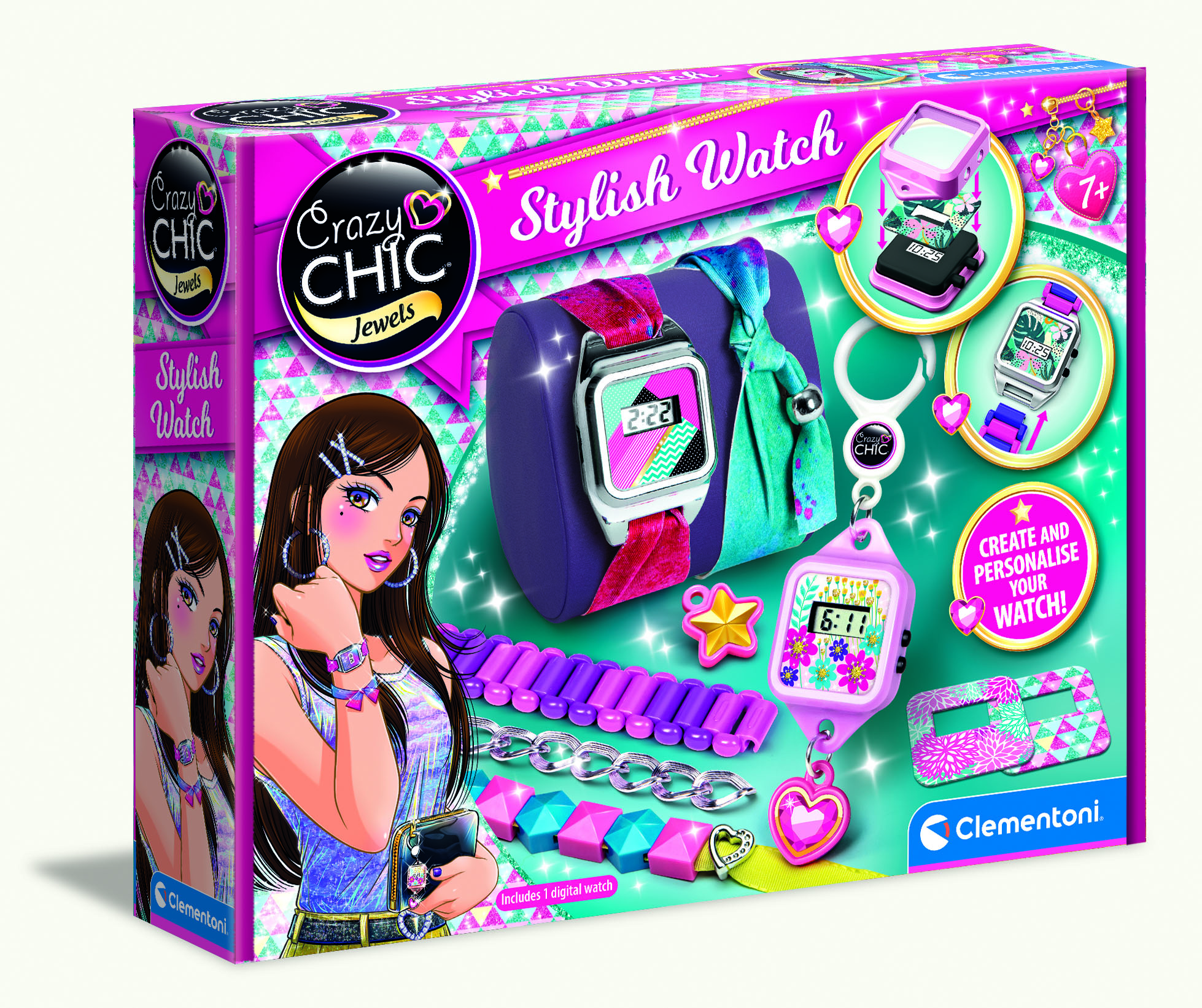 Sprawdzanie godziny to nowy trend! Wystarczy dobrać kolorowe moduły do podczepienia lub pasek i włożyć tarczę zegara, aby co godzinę powstawał nowy zegarek! Dziewczynki najbardziej lubią zabawki z możliwością personalizowania, dlatego z zegarkiem Crazy Chic każda biżuteria staje się wyjątkowa i niepowtarzalna, tworzona zgodnie z własnym gustem. Design zegarków jest inspirowany "dorosłymi" modelami, ponieważ wierne odwzorowanie zachęca dziewczynki do wyboru zabawki, z którą mogą poczuć się modnie i trendy. Zegarek, za każdym razem inny i nowy, gdy przyjdzie ochota na zmianę stylu, coś nowego i oryginalnego. Wystarczy zmienić pasek, łańcuszki lub wybrać inne kolory i tekstury, aby uzyskać nowy wygląd. W książeczce znajdują się objaśnienia, jak wykonać paski lub połączyć łańcuszki i tarcze zegarka, ale dziewczynka może swobodnie dobierać ulubione kolory, styl i tekstury. Kolory łańcuszków i materiałów wybranych na paski podążają za modą i trendami, aby przeróżne zestawienia zawsze były cool. Pomyślany, zaprojektowany i opracowany we Włoszech. Docelowy wiek 7+