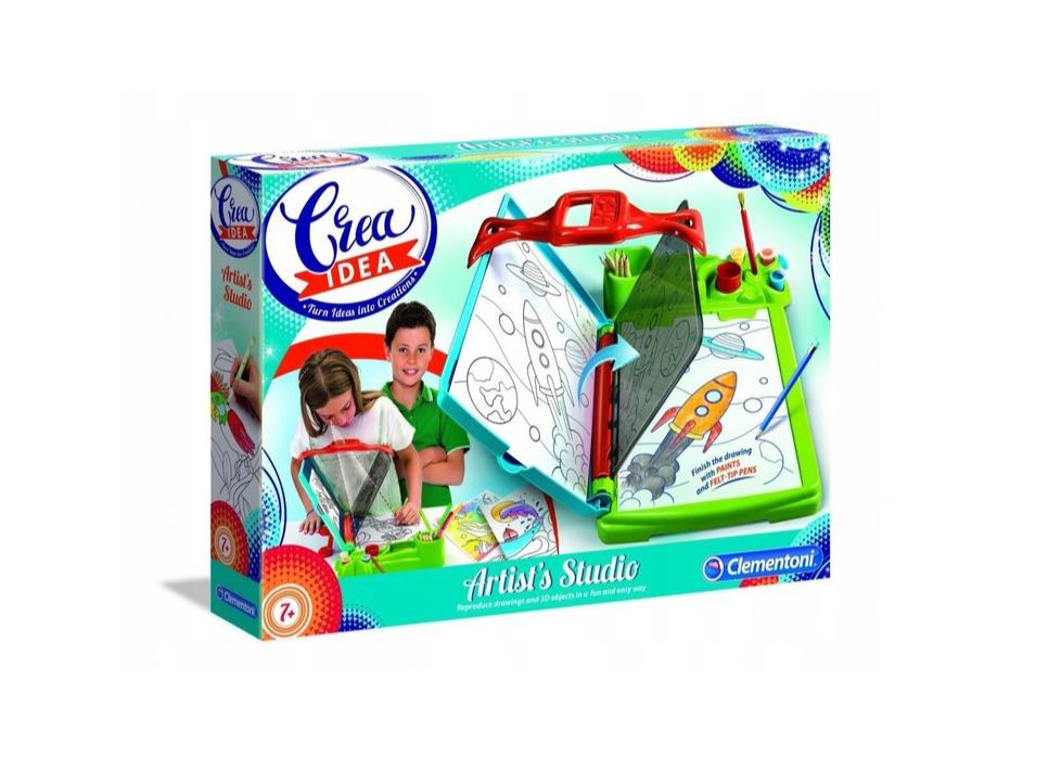 Zawartość: zestaw do rysunku do samodzielnego montażu, podkładki przeciwpoślizgowe, rysunki do kopiowania, białe kartki, kartoniki zacieniające, ramka, pisaki, farby, kubeczek na wodę, kredki, naklejka, ilustrowana instrukcja. Dla dzieci w wieku od 7 lat