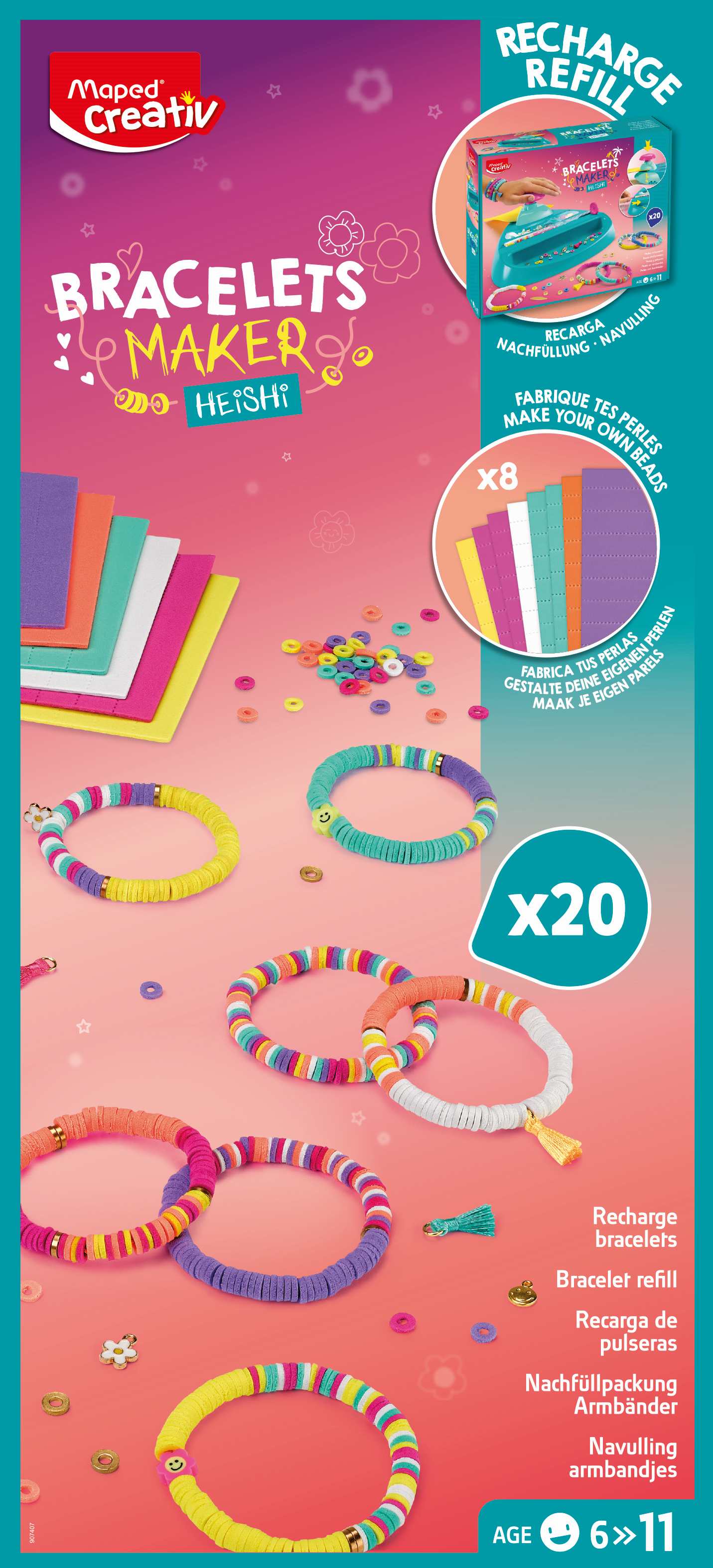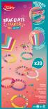 Zestaw zawiera: 3 frędzle, 10 okrągłych złotych koralików, 4 charmsy, 500 cm elastycznej nici, 8 arkuszy z tworzywa EVA w 6 kolorach (tworzywo bezpieczne, lekkie doskonale poddające się cięciu, a jednocześnie przyjemne w dotyku). Możliwość stworzenia 20 nowych bransoletek.