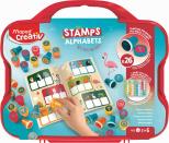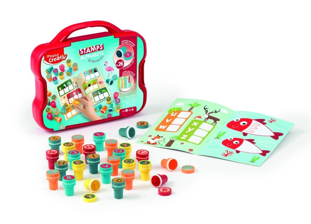 Kompletny zestaw do zabawy: 26 kolorowych stempelków, 1 książeczka zawierająca 8 stron zadań do samodzielnego wypełnienia. Wszystko zapakowane w praktyczną, plastikową walizeczkę koloru czerwonego, pomocną w utrzymaniu porządku.
