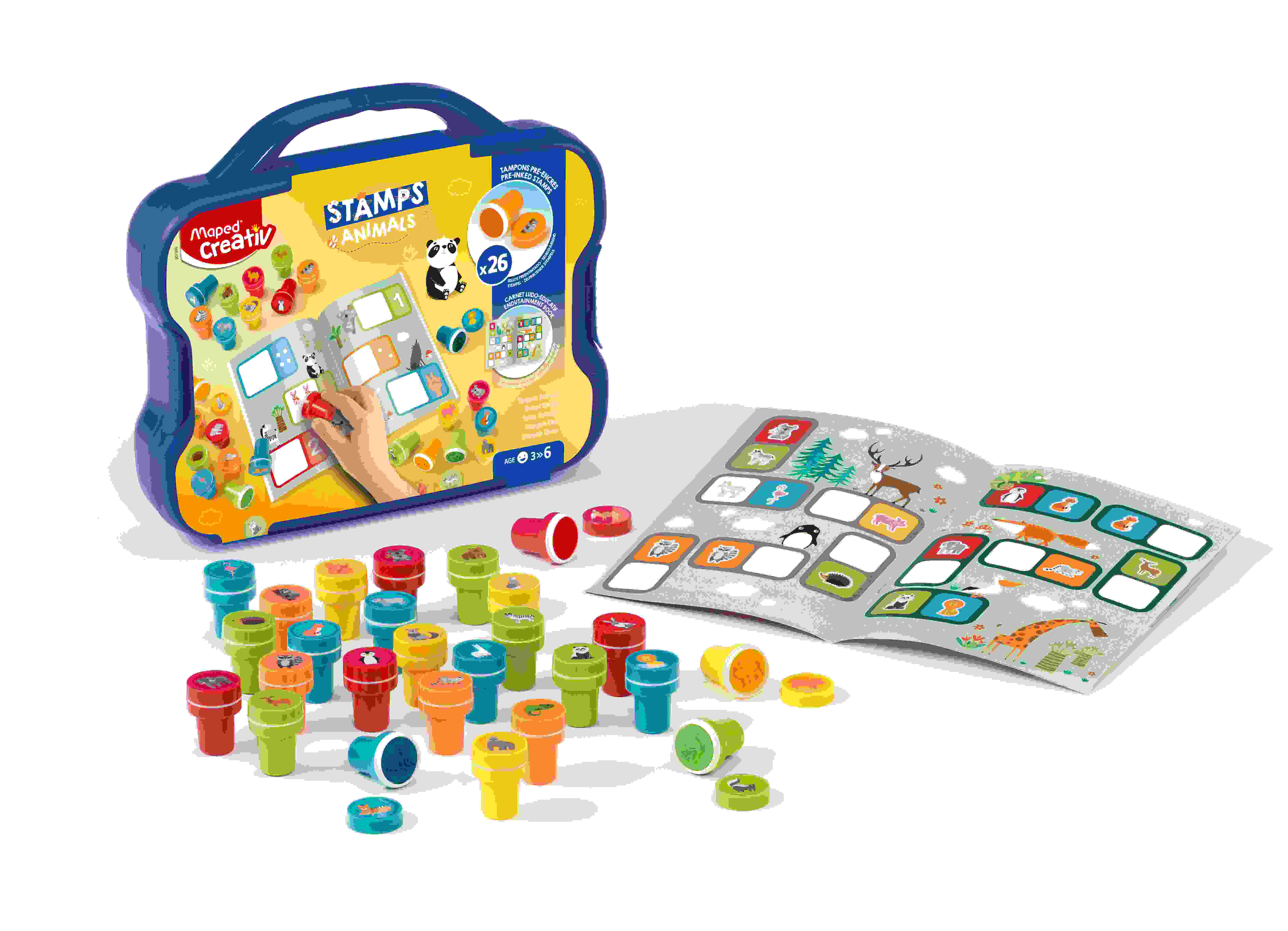 Kompletny zestaw do zabawy: 26 kolorowych stempelków, 1 książeczka zawierająca 8 stron zadań do samodzielnego wypełnienia. Wszystko zapakowane w praktyczną, plastikową walizeczkę koloru czerwonego, pomocną w utrzymaniu porządku.