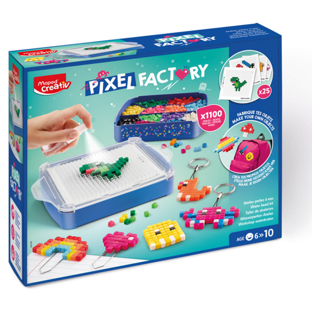 Pudełko zawiera tackę do układania, pojemnik na koraliki z 12 przegródkami, 1110 koralików o sześciennym kształcie w 12 kolorach, 10 arkuszy z łącznie 25 szablonami o różnym poziomie trudności, 30+20 specjalnych koralików, 12 akcesoriów (spinacze, przypinki, magnes, brelok...), spray.