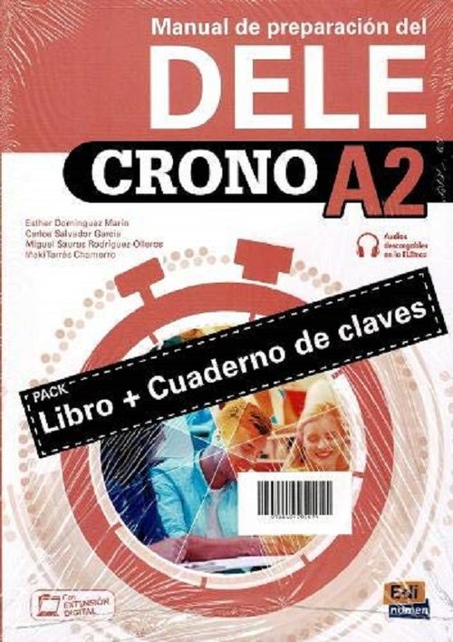 Crono A2. Pack Manual de preparación del DELEIncluye: Pack con el Libro + el Cuaderno de claves.Recursos extras para profesores y estudiantes en la ELEteca (disponibles durante 4 anos a partir del momento de su activación): actividades extras de cada prueba, audios y transcripciones.El Pack está disponible en papel y en formato digital eBook.Importante: Crono A2 está disenado de acuerdo con los cambios realizados, por el Instituto Cervantes, en el examen DELE desde la convocatoria de febrero de 2020. Los exámenes para obtener el DELE, como cualquier examen, pueden sufrir cambios. El Instituto Cervantes actualiza constantemente los contenidos de los exámenes en relación con dos documentos: el Marco común europeo de referencia y el Plan curricular del Instituto Cervantes.Libro:Crono A2 es un manual creado por profesores del Instituto Cervantes que son examinadores oficiales del DELE. El objetivo es preparar el examen de una manera eficaz y en poco tiempo. Los modelos de examen están hechos exactamente como el modelo de muestra del Instituto Cervantes. El libro incluye materiales especiales para la preparación de la entrevista: ejemplos de preguntas que pueden hacer los examinadores. Contiene también Hojas de respuestas fotocopiables como las del examen real.En la ELEteca los estudiantes encontrarán actividades que permiten desarrollar habilidades exclusivas de cada prueba del examen, los audios y las transcripciones.