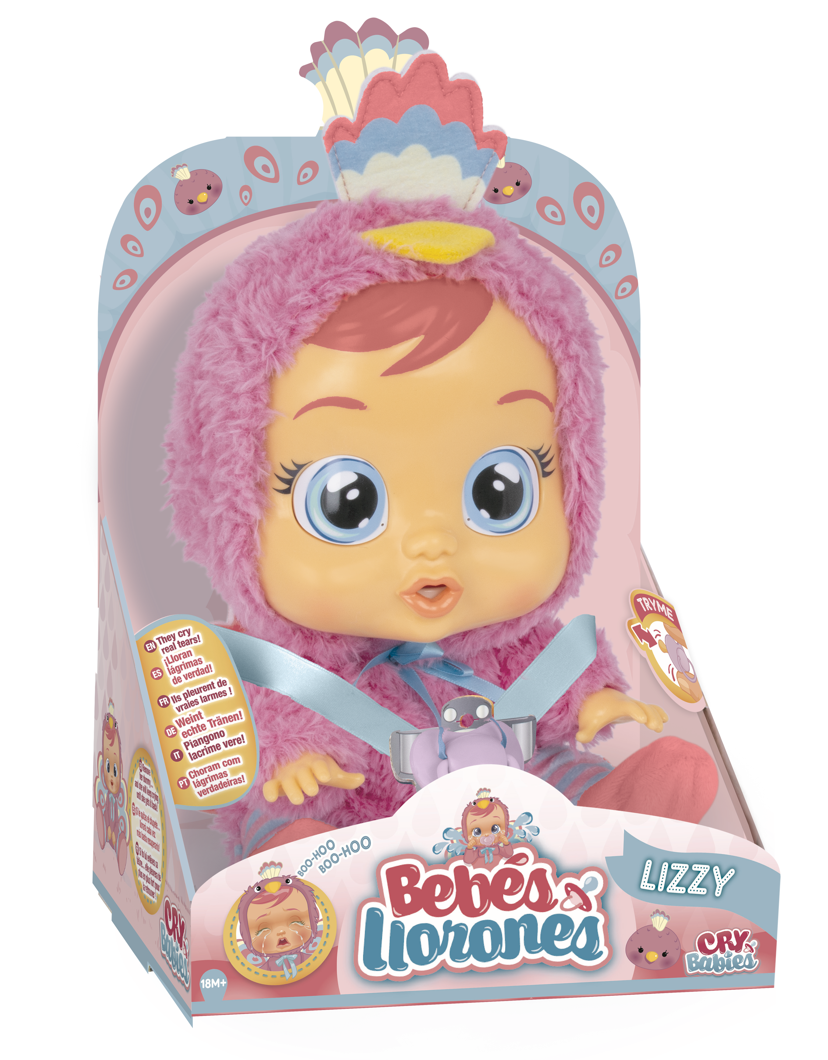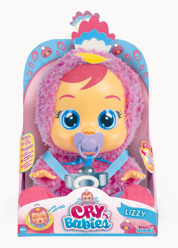 Lizzy - jest kolorowym, pierzastym pawiem z serii Cry Babies. Jest urocza, ale po wyjęciu smoczka z buzi płacze prawdziwymi łzami. Jeśli go nie dostanie z powrotem, nie przestanie płakać a nawet będzie płakać jeszcze głośniej! Lalka uczy odpowiedzialności i opiekuńczości.