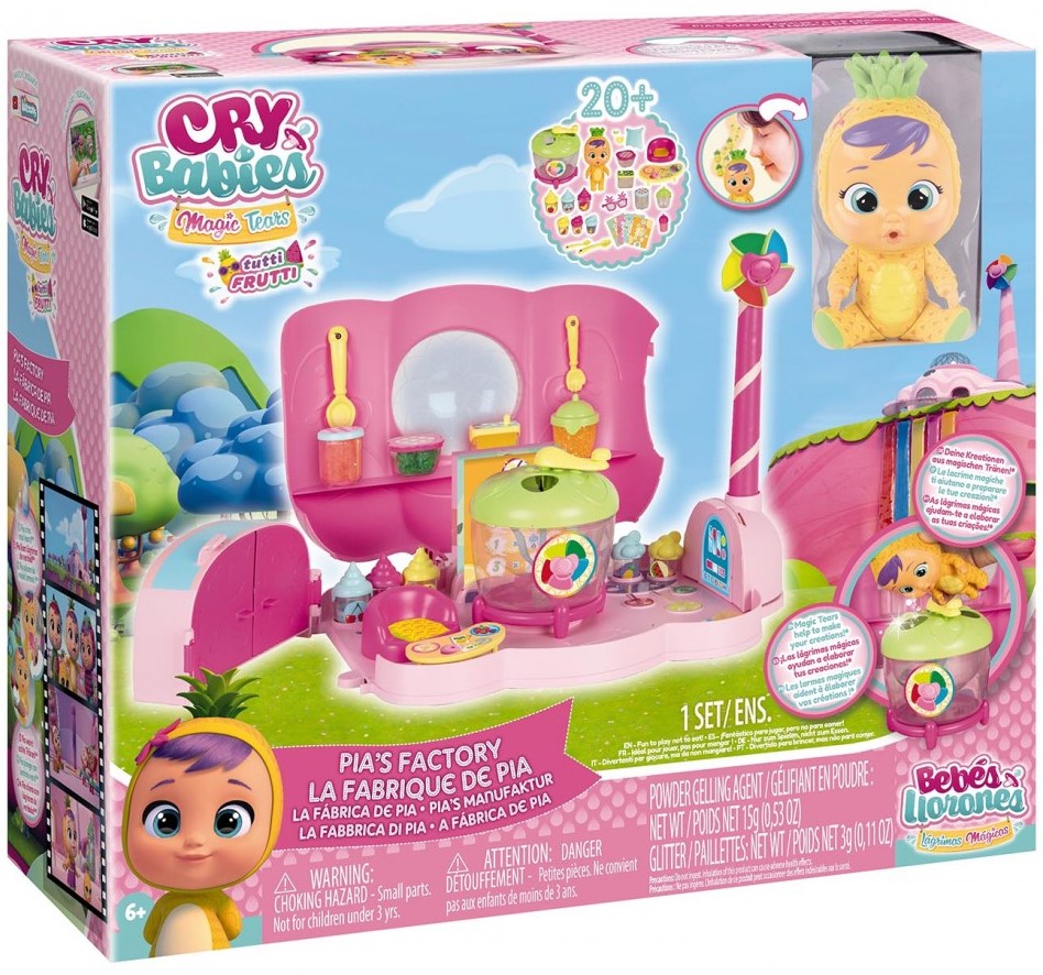 Odkryj fabrykę Tutti Frutti! Wejdź w świat niekończącej się zabawy się z Pią, laleczką Cry Babies Magic Tears. Uruchom produkcję dzięki magicznym łzom swojej laleczki i stwórz razem z nią takie pyszności jak: