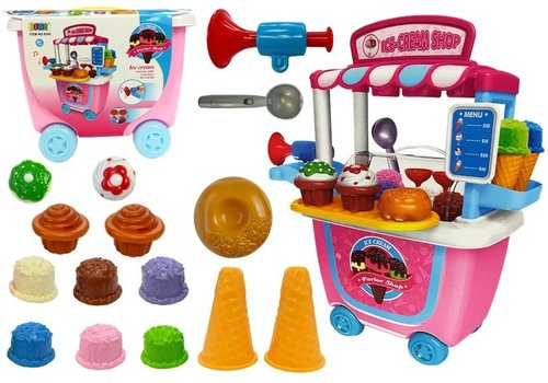 Na wakacyjnych wyjazdach dzieci znajdują dla siebie wiele atrakcji - zjeżdżalnie, place zabaw, ale chyba największą atrakcją są stanowiska sprzedające lody. Ustawione w strategiczny sposób w pobliżu miejsc obleganych przez dzieci, są właściwie gwarantowanym sukcesem. Nasz przenośny zestaw do zabawy w Sprzedawcę Lodów pozwoli Twojemu dziecku poczuć się jak najprawdziwszy cukiernik! Urocza walizka na kółkach mieści w sobie całe wyposażenie stanowiska, takie jak dodatkowy stelaż, baldachim, półeczki na gotowe lody czy lada chłodnicza. Nie może oczywiście zabraknąć samych lodów - jest ich kilka kolorów, a także dwa zabawkowe wafelki i pucharki. Lodziarnia-cukiernia wyposażona jest także w muffinki i donuta, zabawkową łyżkę do lodów, a także klakson nawołujący dzieci do skorzystania z oferty. Zabawka ze względu na niewielkie elementy przeznaczona jest wyłącznie dla dzieci powyżej 3 roku życia. Wymiary złożonej zabawki: 26 cm x 21 cm x 18 cm.