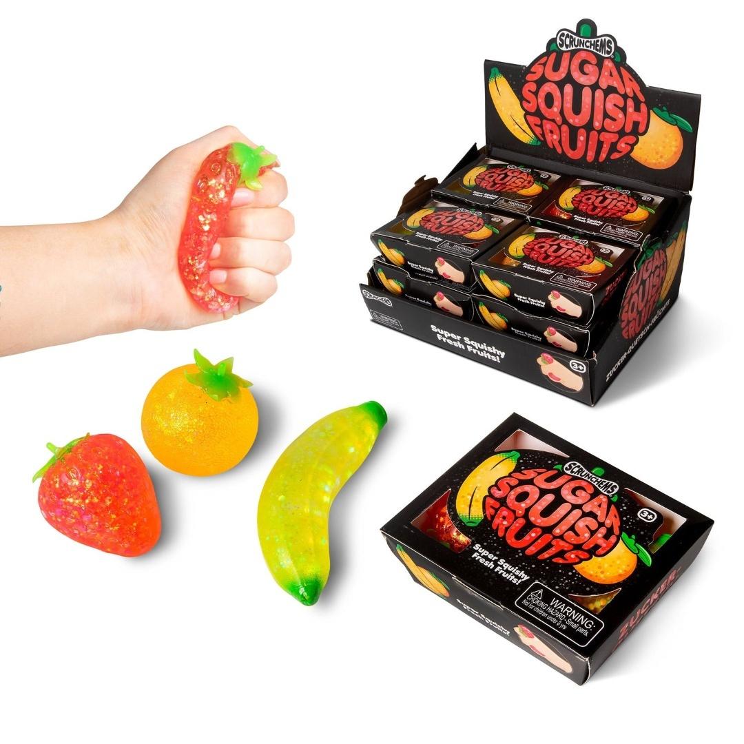 Kolorowe owoce squishy z serii SCRUNCHEMS SUGAR oferują miękką strukturę i realistyczne kształty. Idealne do zabaw sensorycznych.