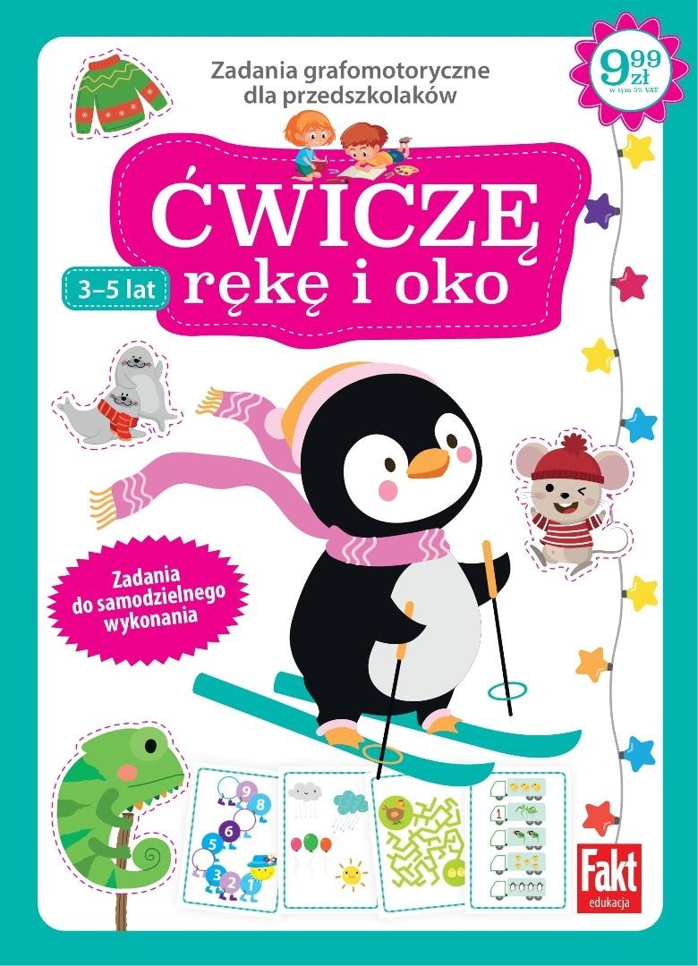 Zabawy grafomotoryczne to zbiór ćwiczeń dla dzieci w wieku przedszkolnym, które w zachęcający sposób przygotowują do nauki pisania. Wesołe zwierzątka i przerywane kolorowe linie łączą naukę z zabawą. Każde z rozwiązanych zadań można pomalować farbami, kredkami, flamastrami lub wykleić kolorowym papierem. "Ćwiczę rękę i oko" to kreatywne narzędzie pomocne w rozwijaniu motoryki małej.