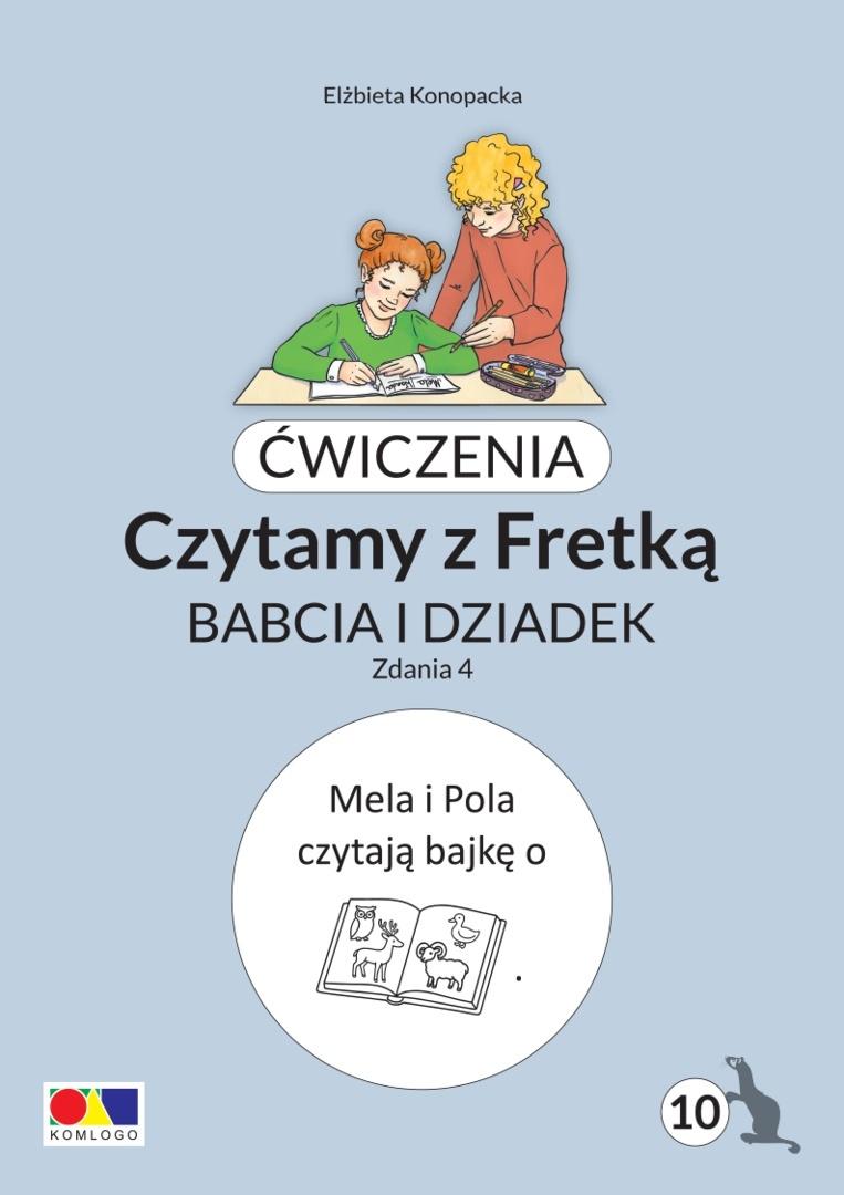 Babcia i dziadek. Zdania 4 to dziesiąty zeszyt z serii Czytamy z Fretką ćwiczenia. Znajduje się w nim 100 różnych zadań dotyczących czytania zdań i tekstów zbudowanych z wyrazów złożonych z sylab otwartych i zamkniętych w różnych konfiguracjach. Wykonując proponowane aktywności, dziecko ma również możliwość ćwiczenia czytania ze zrozumieniem oraz rozwijania kompetencji językowej i komunikacyjnej.