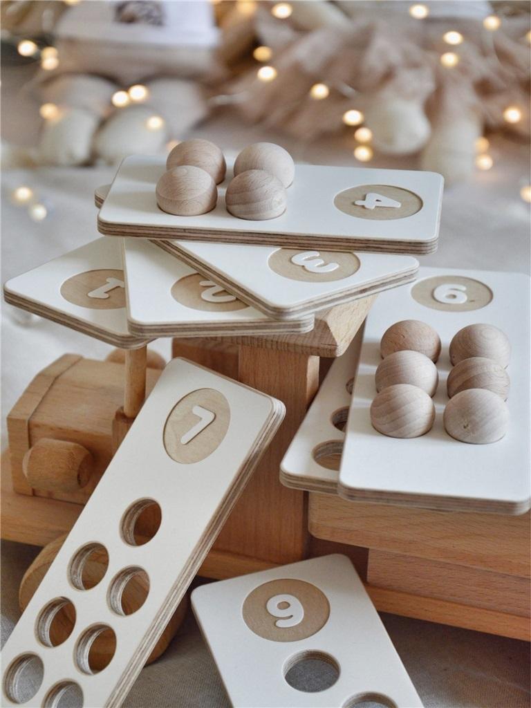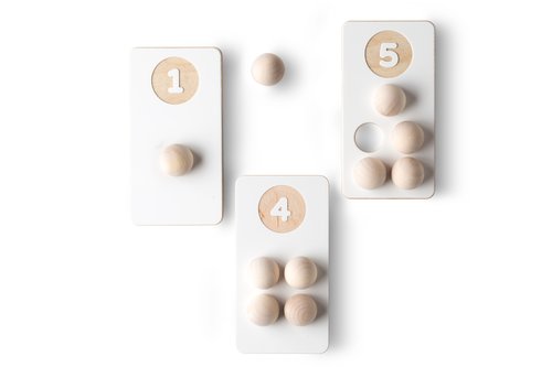Każdy element ma wycięte otwory, w które dziecko może dopasowywać dołączone do zestawu kulki. Ilość otworków odpowiada liczbie wygrawerowanej na klocku - od 1 do 10.